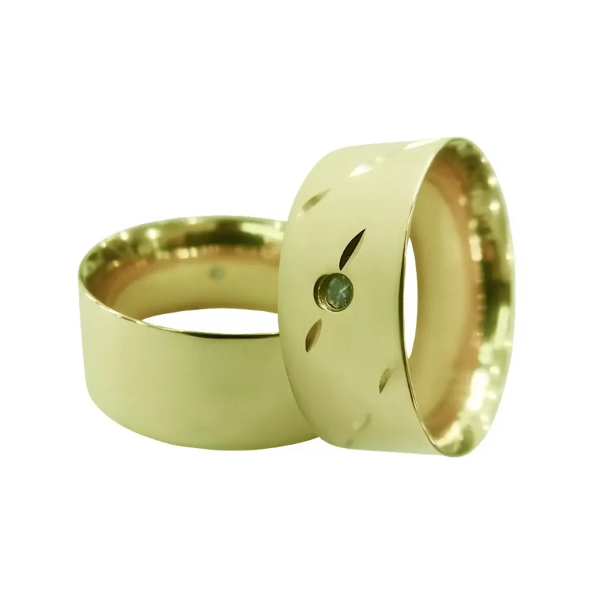 O destaque fica para o brilhante cravado na aliança feminina, que adiciona um toque de luz e sofisticação à peça, tornando-a perfeita para casais que valorizam detalhes únicos e cheios de significado.