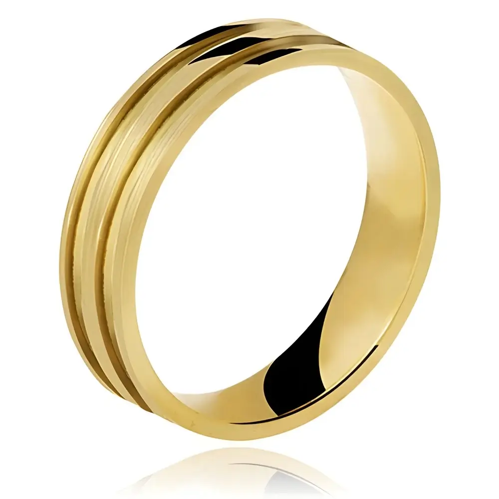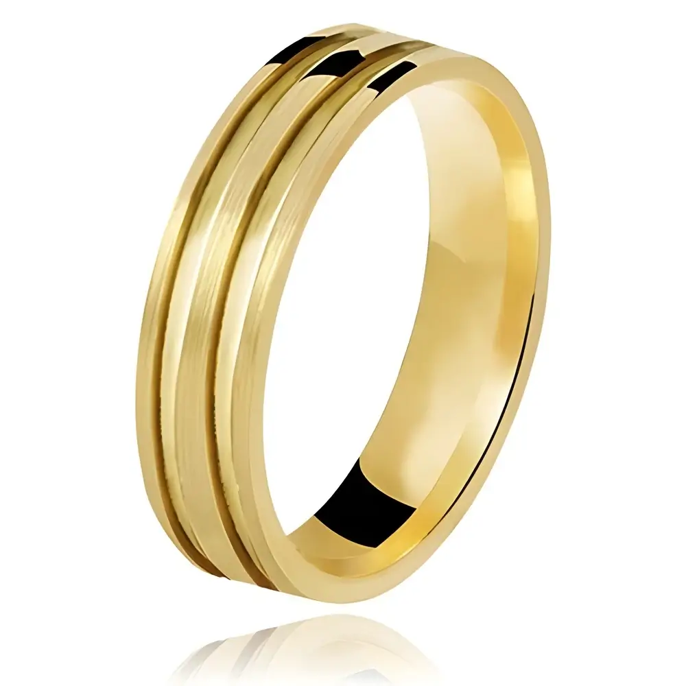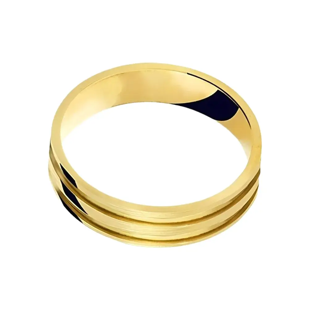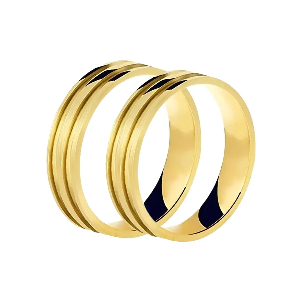 Elegância e equilíbrio em cada detalhe. A Aliança de Ouro 10k Reta com Dois Frisos Centrais Polidos é a escolha perfeita para casais que desejam uma joia clássica com um toque contemporâneo. O acabamento escovado confere um visual fosco e sofisticado, enquanto os dois frisos polidos centrais criam contraste e luminosidade, destacando o brilho natural do ouro 10k.