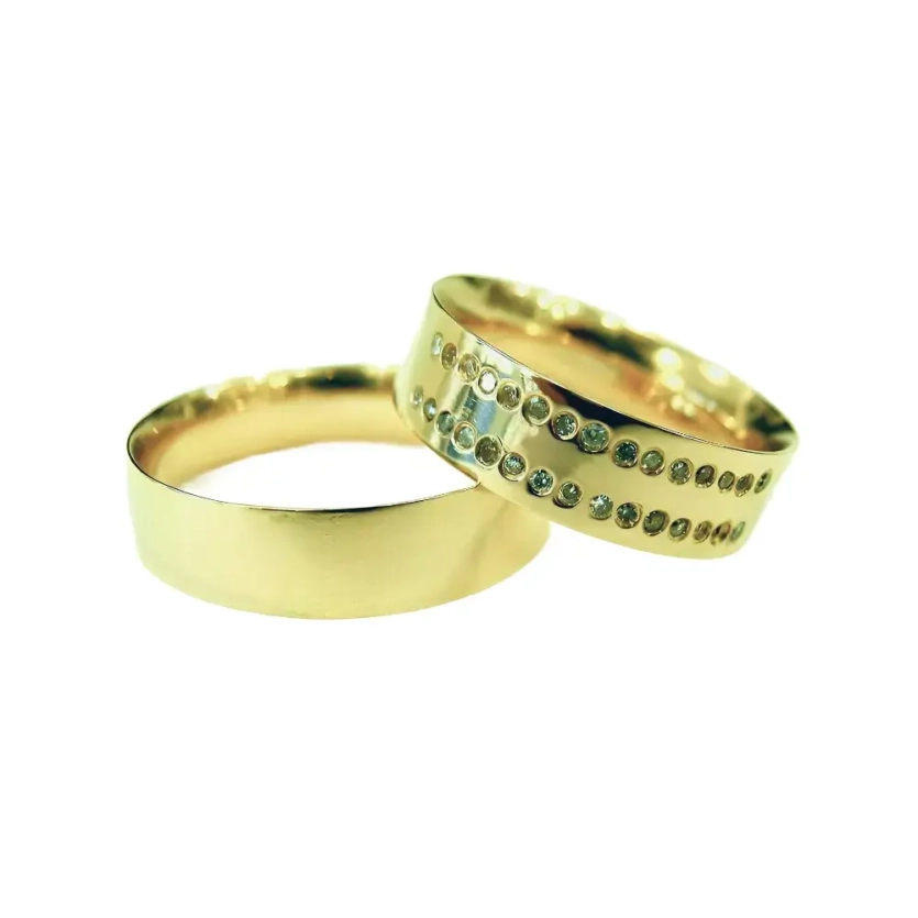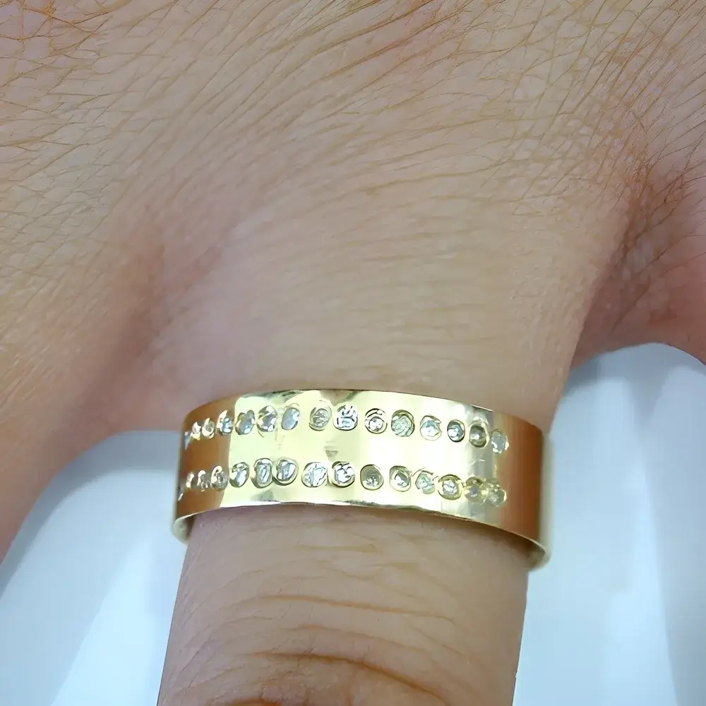 Cada pedra reflete a luz com intensidade única, simbolizando momentos e memórias que eternizam a trajetória do casal. Uma aliança imponente, moderna e repleta de significado — perfeita para celebrar amores que brilham para sempre.