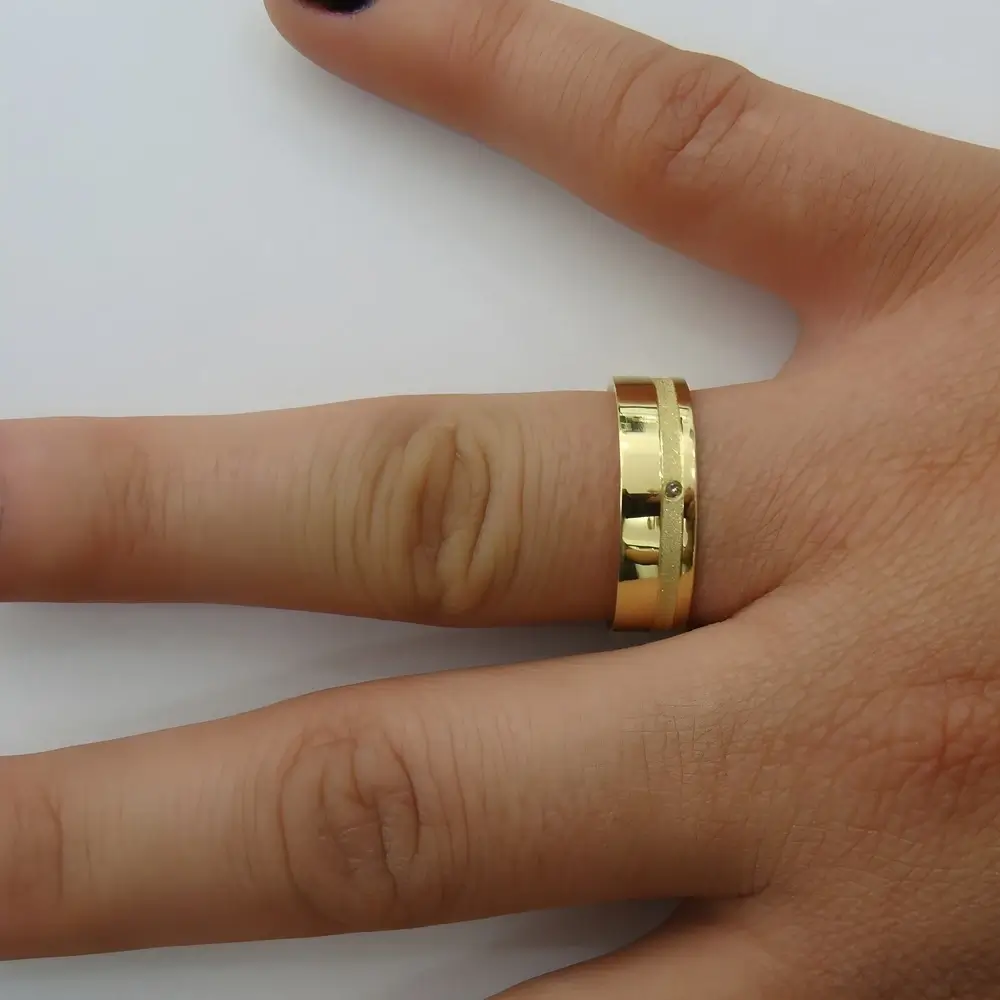 Seu formato reto e anatômico oferece conforto e elegância, ideal para o uso diário. O contraste entre o acabamento liso e diamantado proporciona um visual moderno e equilibrado, tornando esta aliança perfeita para casais que buscam beleza e significado em uma única joia.