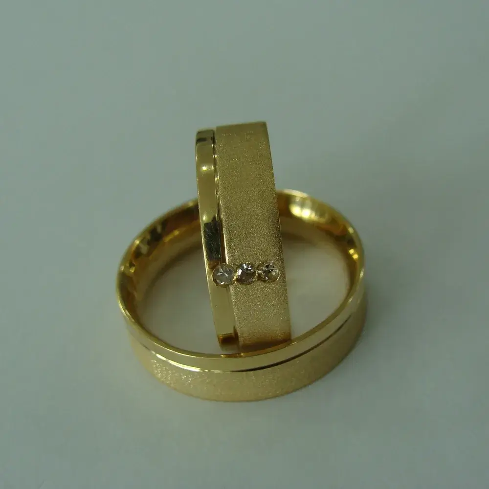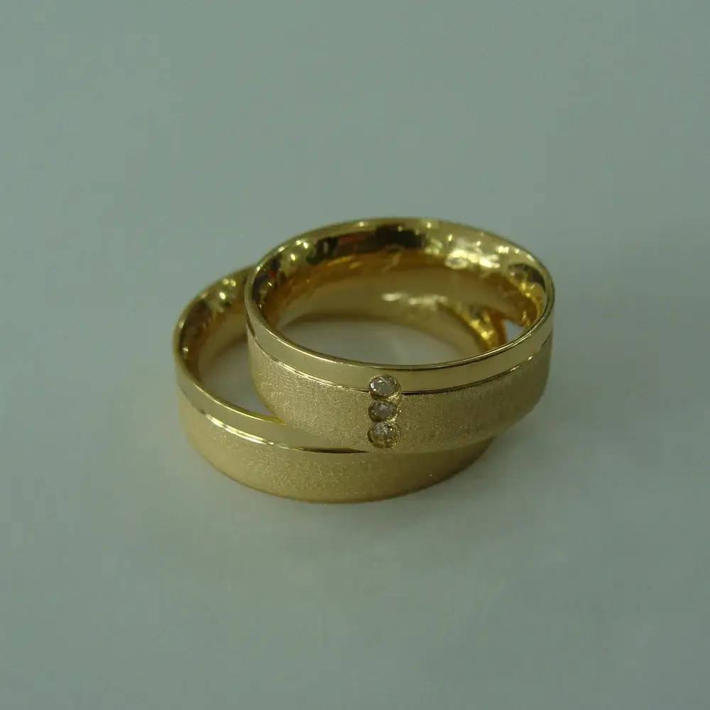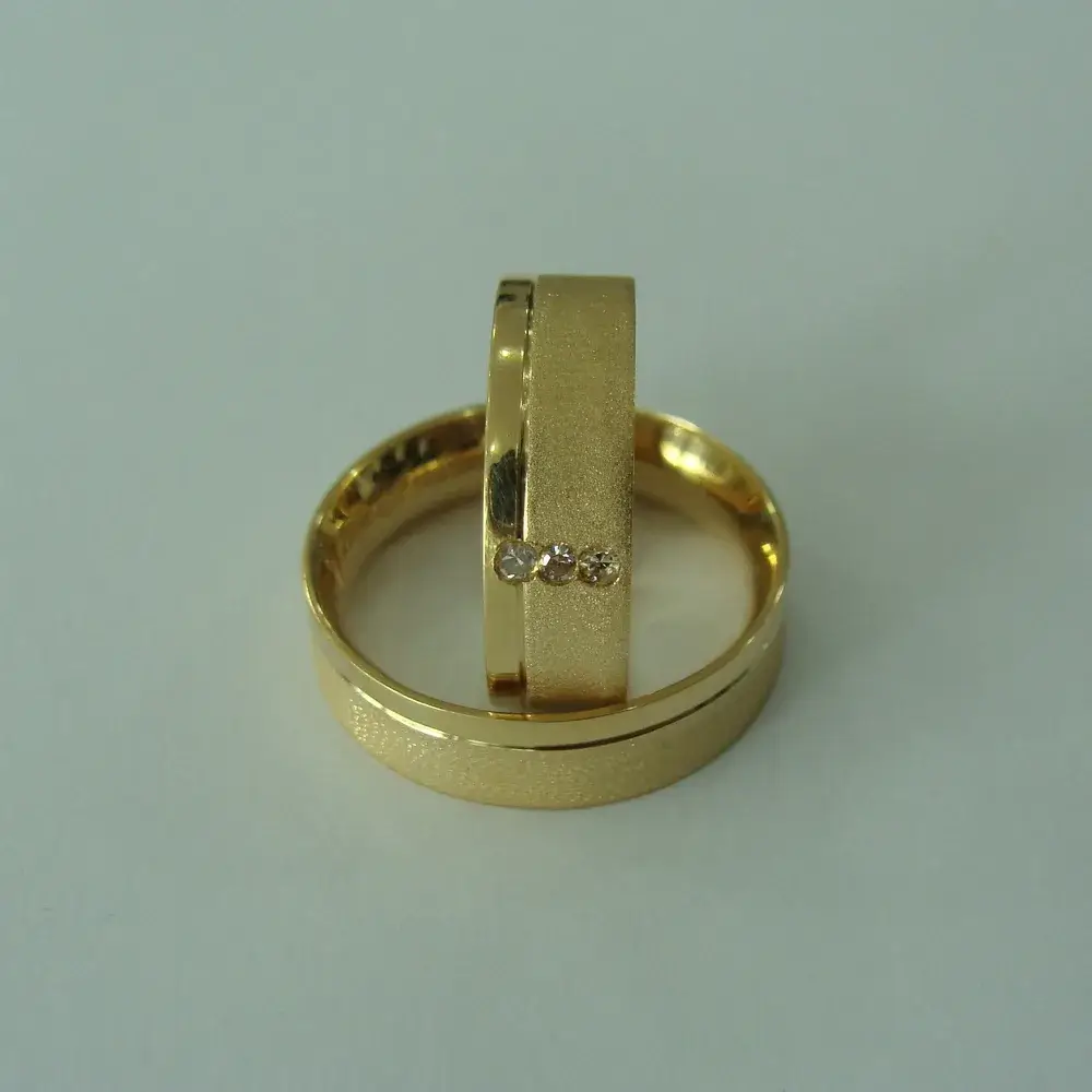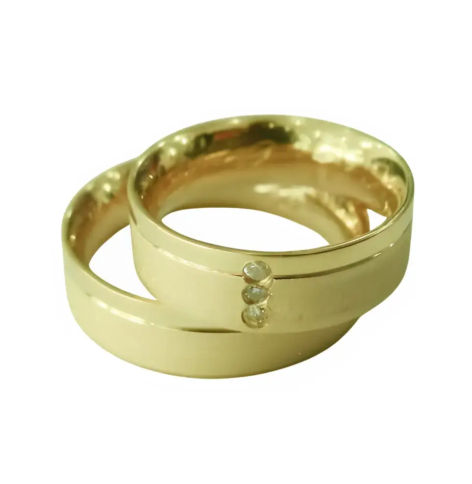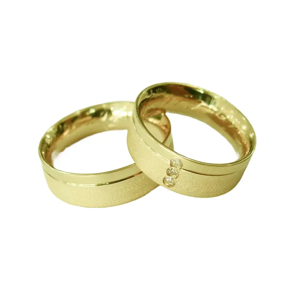 O friso lateral confere personalidade e requinte à peça, e os três brilhantes cravados na aliança feminina refletem a luz e a intensidade do amor em todas as suas fases — passado, presente e futuro. Uma joia feita para celebrar momentos únicos e eternos.