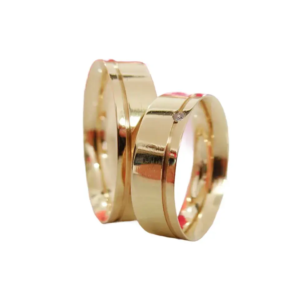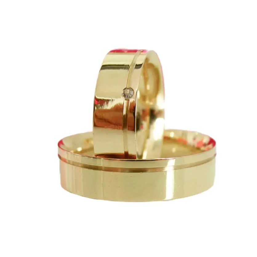 O friso lateral traz um toque de modernidade e destaque ao ouro 10k, e o diamante delicadamente cravado na aliança feminina simboliza a força e a pureza do amor verdadeiro. Uma joia que representa o compromisso eterno de forma discreta, mas profundamente significativa.