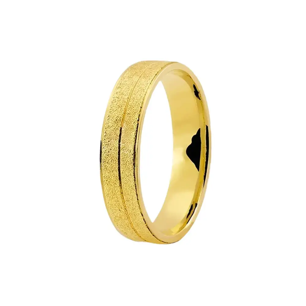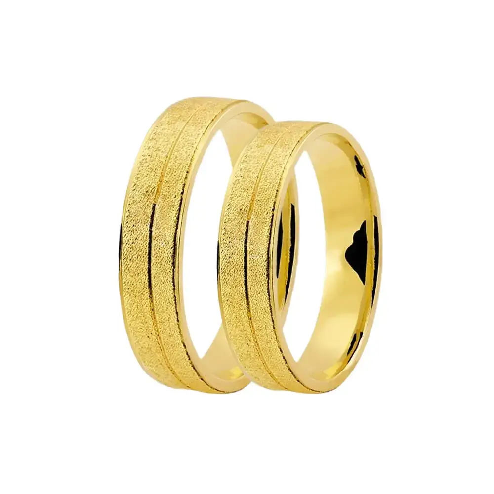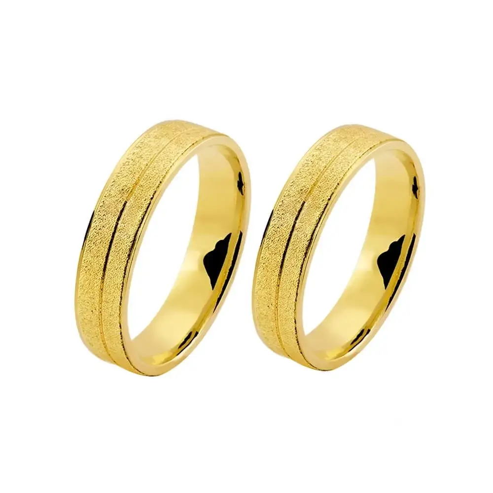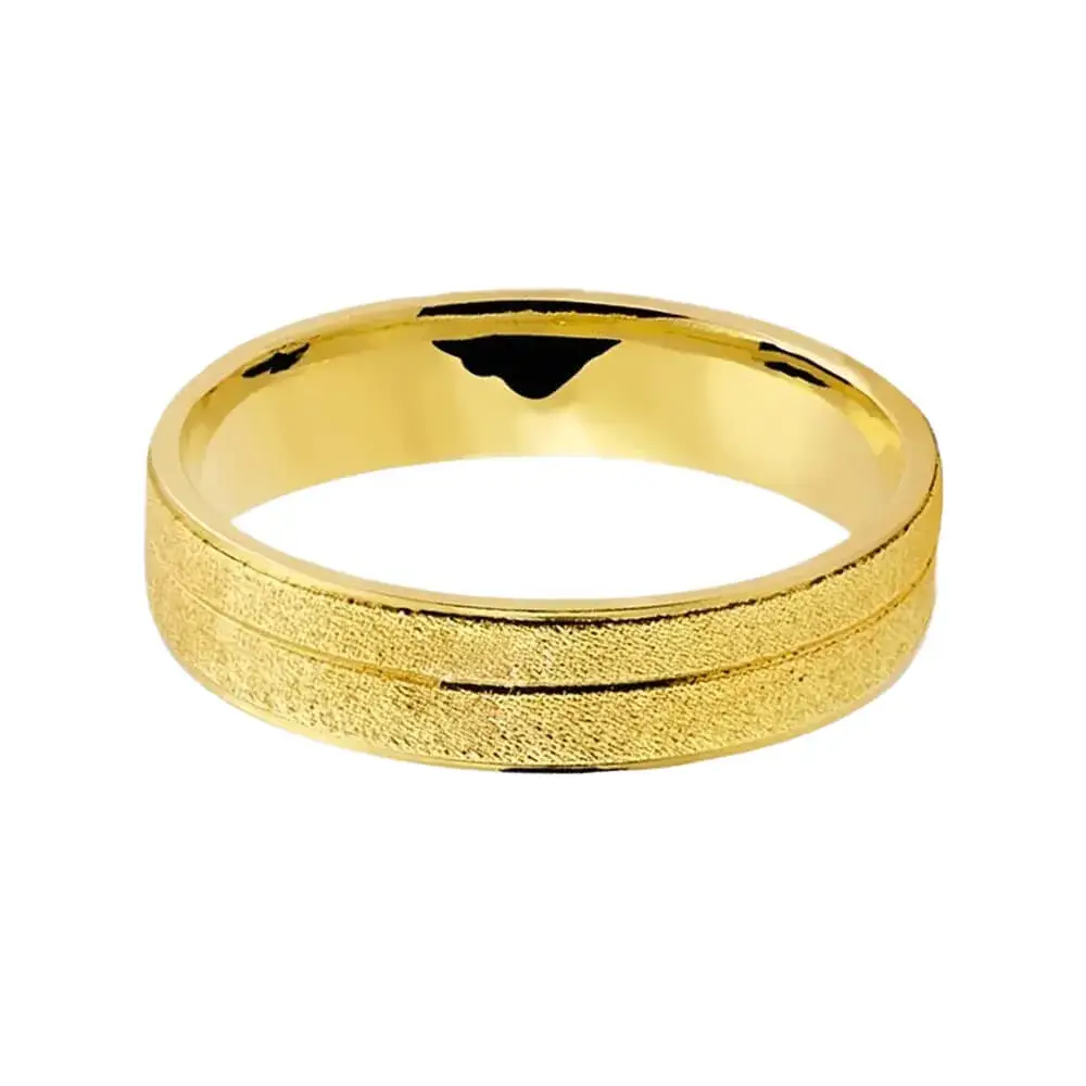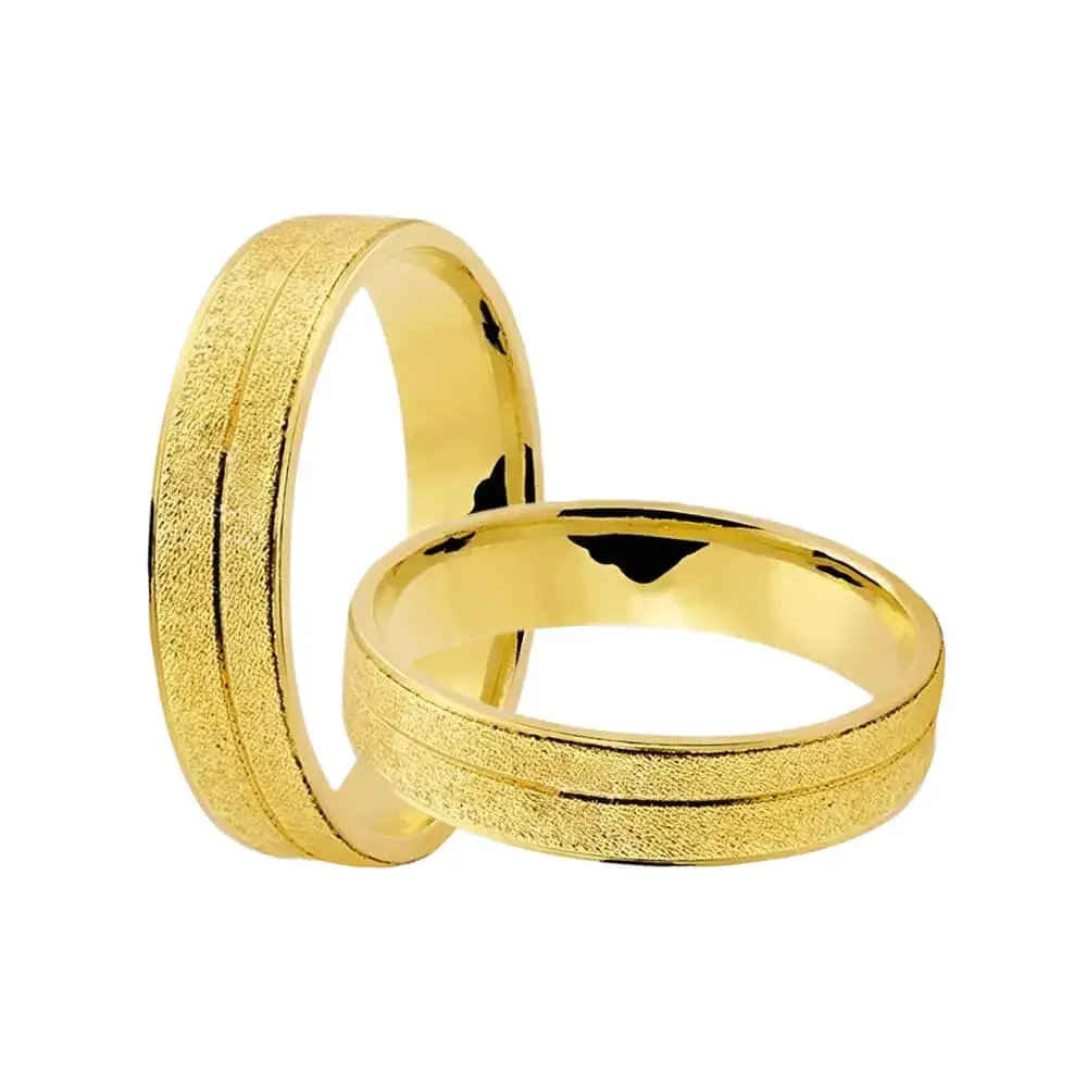 Os frisos central e laterais conferem um toque moderno e detalhado ao design clássico, resultando em uma aliança de presença marcante e estilo refinado. Uma peça ideal para casais que desejam um símbolo duradouro, com brilho e significado em cada traço.