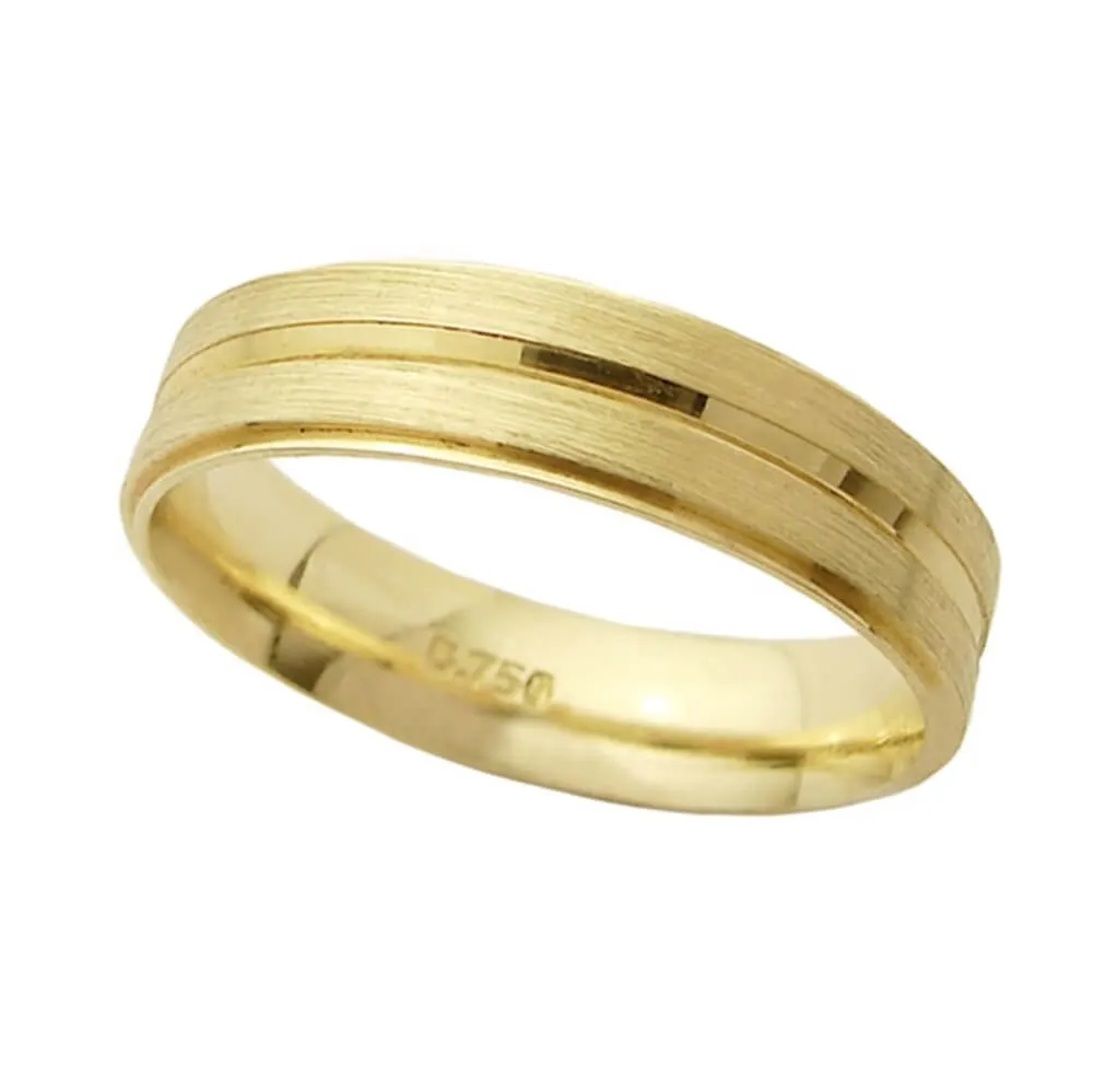 As laterais rebaixadas criam profundidade e valorizam o formato anatômico, garantindo conforto absoluto para o uso diário. Ideal para casais que buscam uma aliança com personalidade, design refinado e a durabilidade incomparável do ouro 10k.