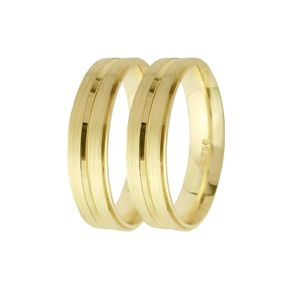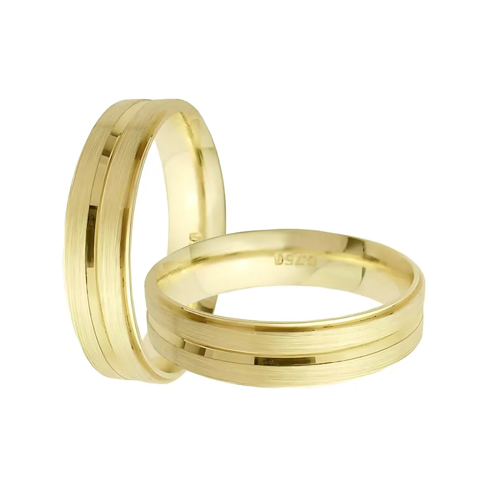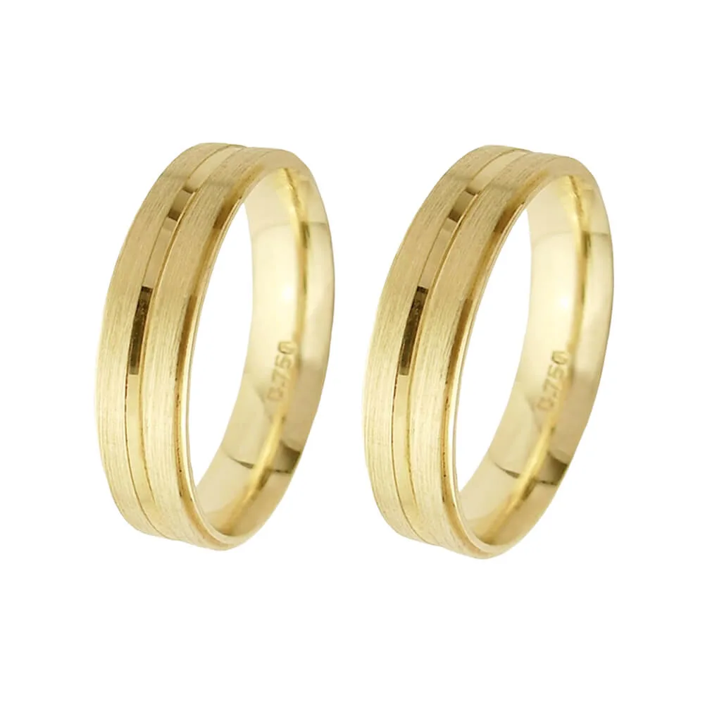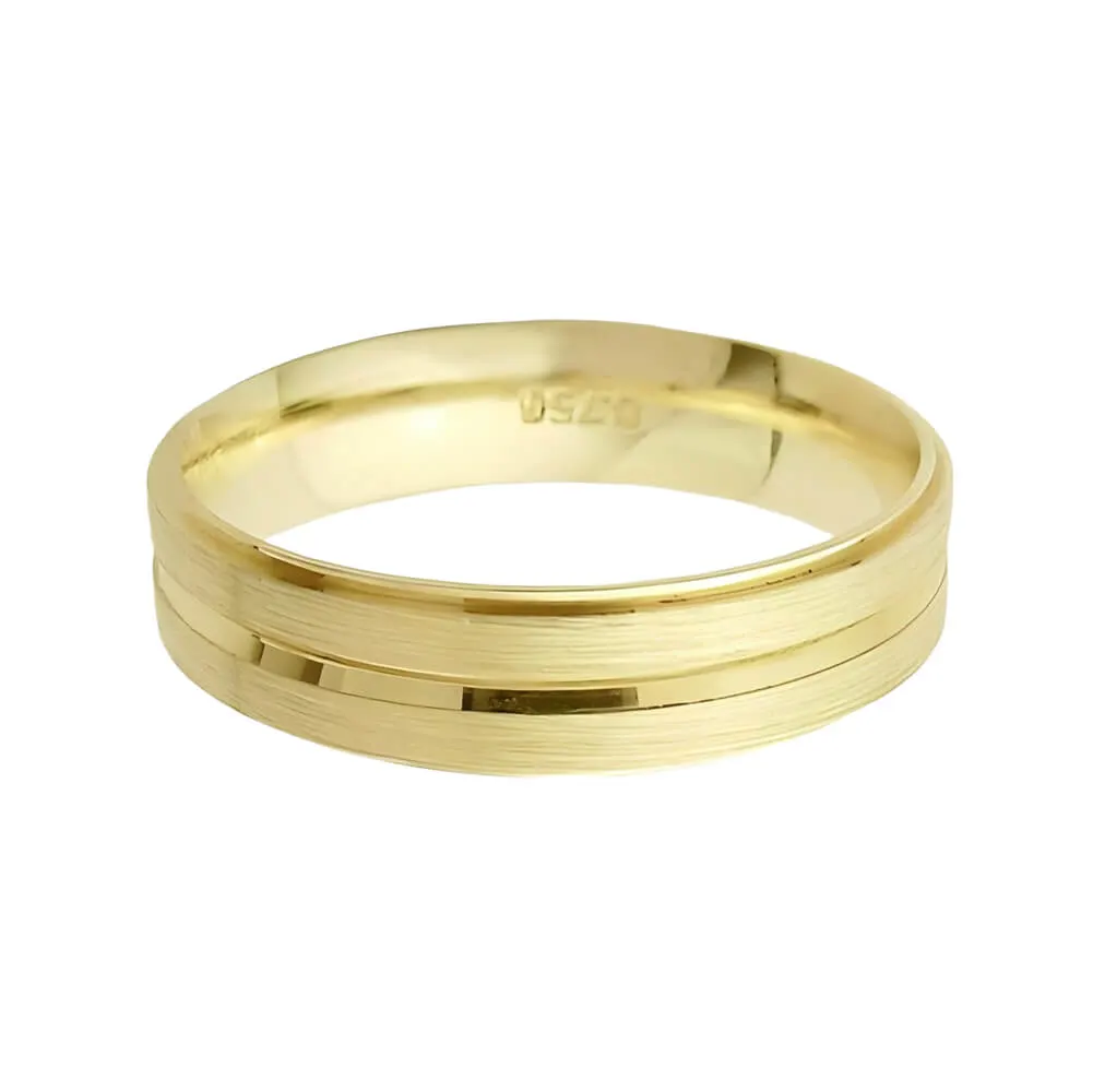 Elegância e modernidade em um só design. A Aliança de Casamento de Ouro 10k Reta Escovada com Laterais Rebaixadas e Friso Central Polido é uma joia que representa o equilíbrio perfeito entre o clássico e o contemporâneo. Seu acabamento escovado confere um toque fosco e sofisticado, enquanto o friso central polido adiciona brilho e destaque à peça.