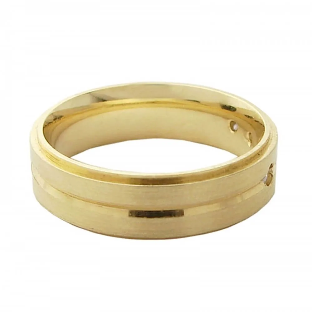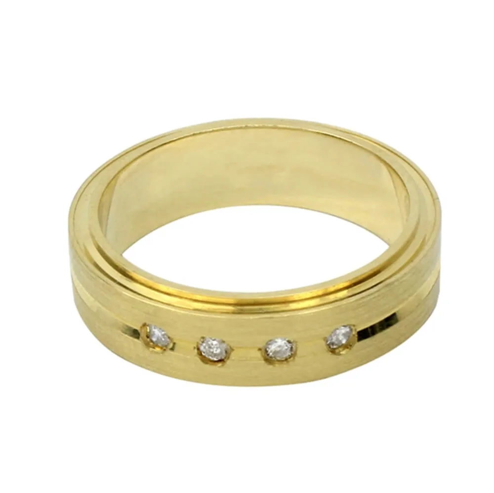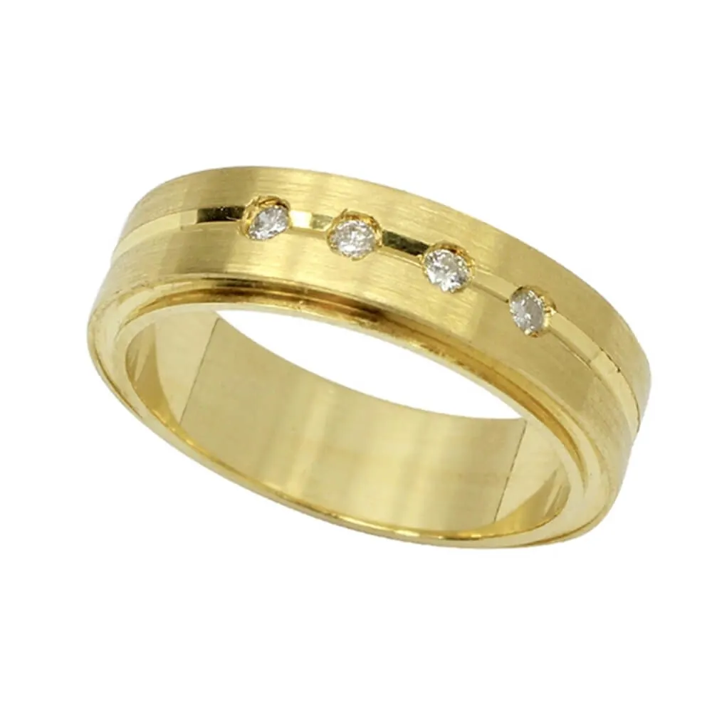 Sofisticação e brilho em harmonia perfeita. A Aliança de Ouro 10k Reta Escovada com Laterais Rebaixadas, Friso Central Polido e 4 Diamantes é uma joia marcante, que une o design moderno ao toque luxuoso das pedras preciosas.