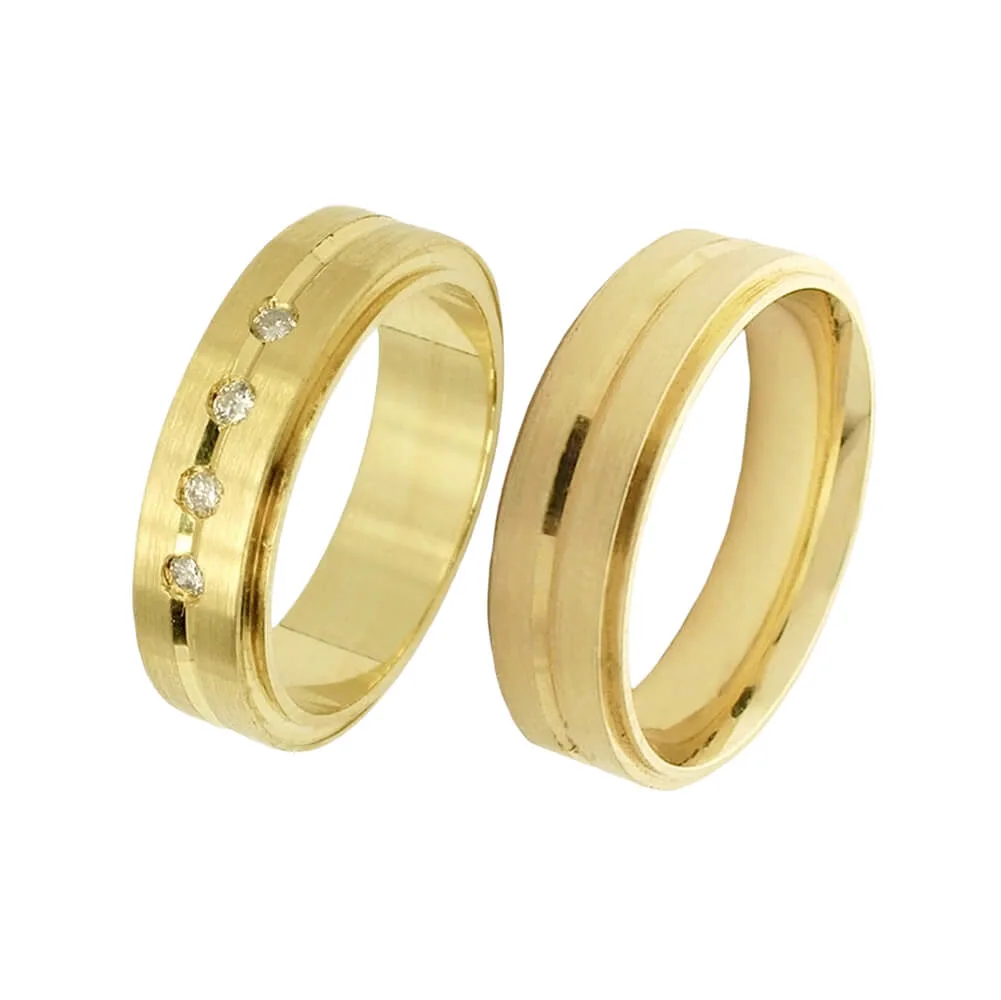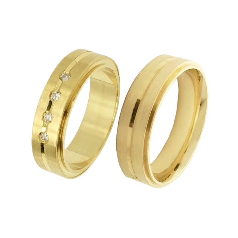 O acabamento escovado proporciona um visual contemporâneo e elegante, enquanto o friso central polido destaca o brilho intenso do ouro 10k. As laterais rebaixadas trazem profundidade e contraste, e os 4 diamantes cravados na aliança feminina simbolizam os quatro pilares de um amor duradouro — confiança, respeito, lealdade e cumplicidade.