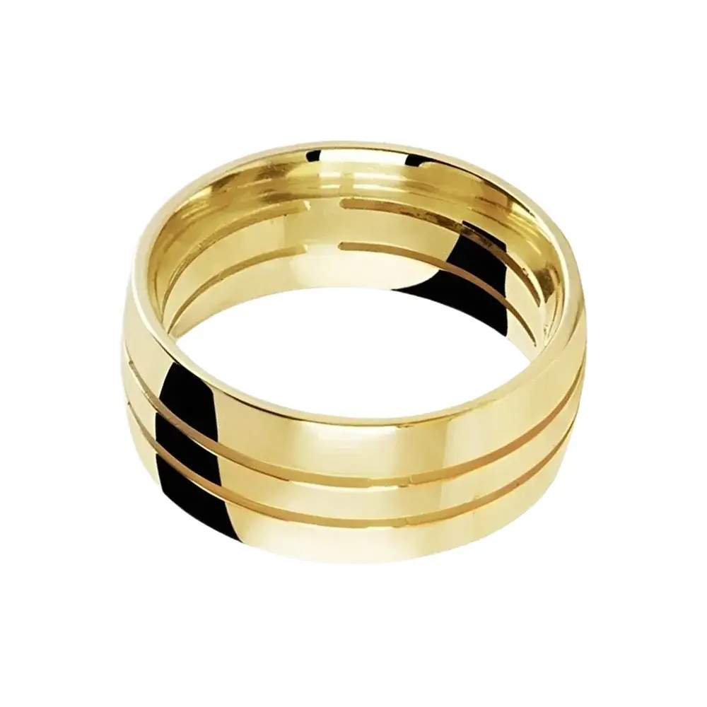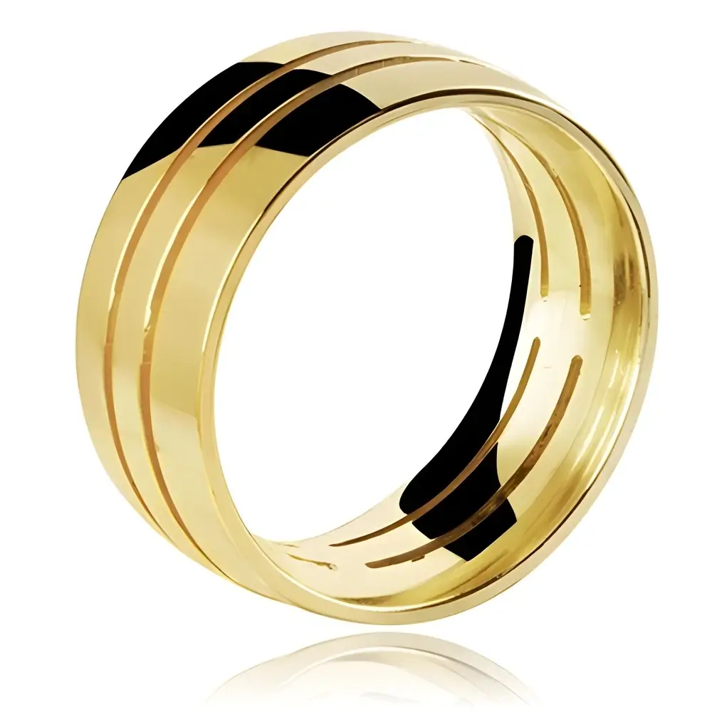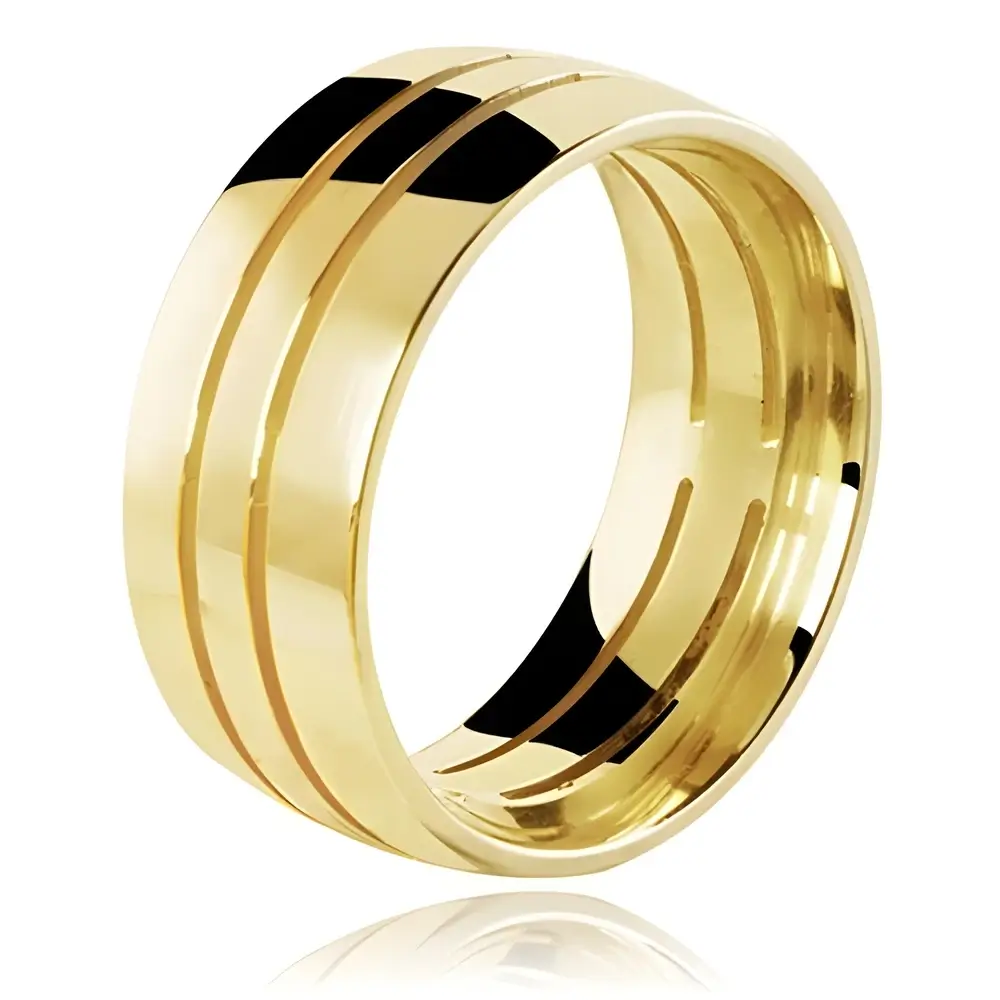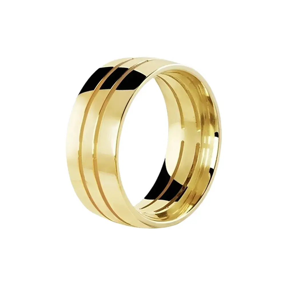 Elegante e atemporal, a Aliança de Ouro 10k Semi Abaulada com Dois Frisos Centrais é uma joia que expressa equilíbrio e sofisticação. Seu design semi abaulado proporciona conforto e harmonia visual, enquanto os dois frisos centrais trazem um toque moderno e detalhado que realça o brilho intenso do ouro 10k.
