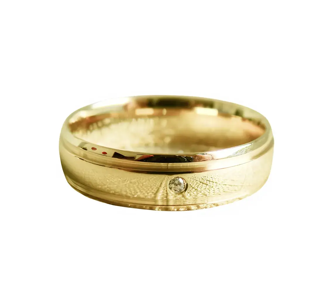 O brilhante central, sutilmente cravado, simboliza a luz e a força do amor verdadeiro — uma joia perfeita para casais que valorizam detalhes que eternizam sentimentos. Ideal para casamentos e noivados, é uma aliança que une beleza, durabilidade e emoção em cada traço.