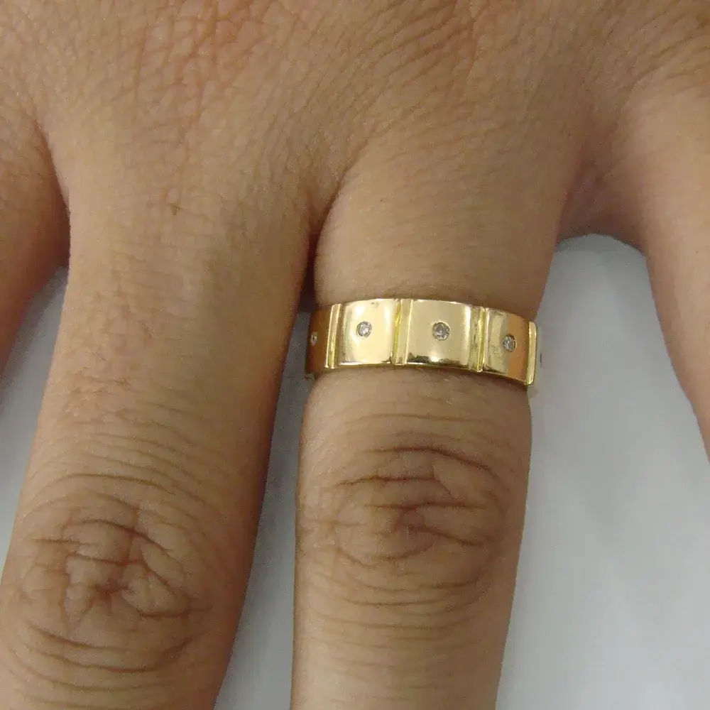 Luxo e significado em uma joia deslumbrante. A Aliança de Ouro 18k Reta com Frisos Horizontais e Brilhantes é uma peça que simboliza a força e a beleza de um amor que se renova a cada dia. O design reto e anatômico proporciona conforto absoluto, enquanto os frisos horizontais criam textura e profundidade, destacando o brilho intenso dos 11 brilhantes cravados com precisão.
