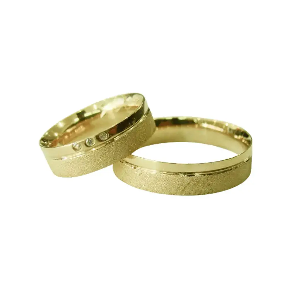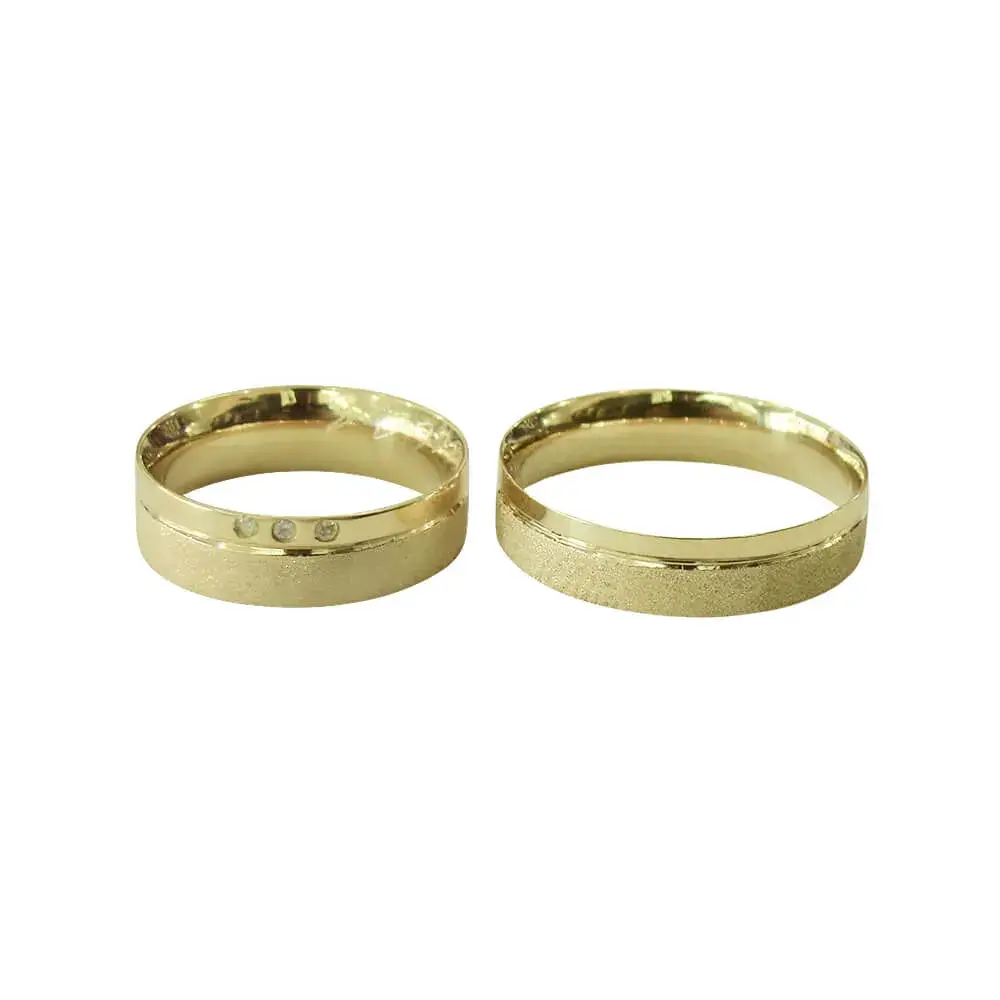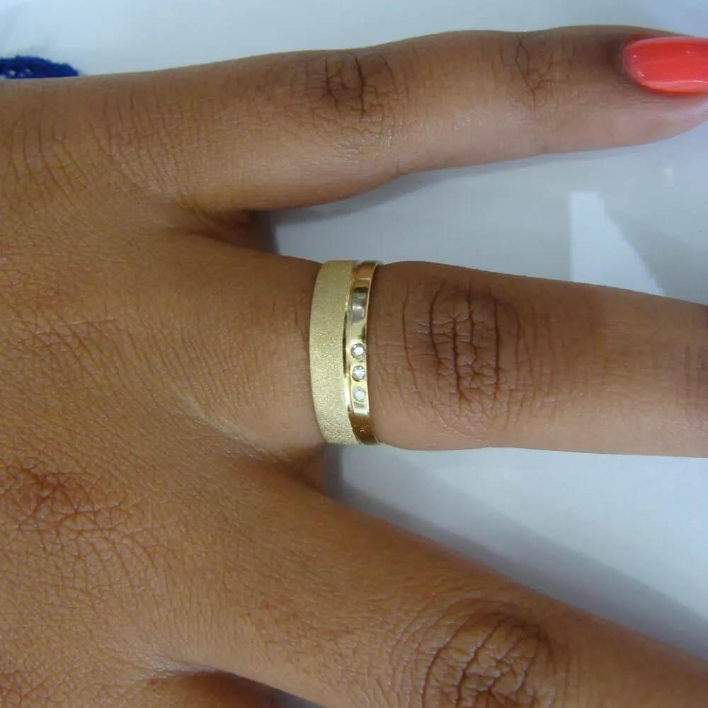 O friso central e as laterais lisas criam um contraste harmonioso entre textura e brilho, destacando ainda mais os três brilhantes cravados na aliança feminina — símbolos do passado, presente e futuro de um amor eterno. Uma peça marcante, feita para quem valoriza detalhes que eternizam momentos.