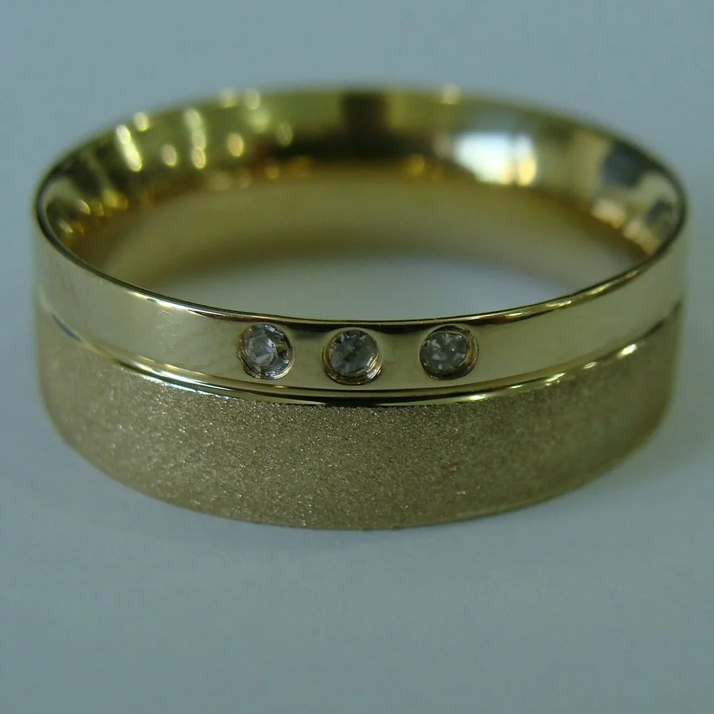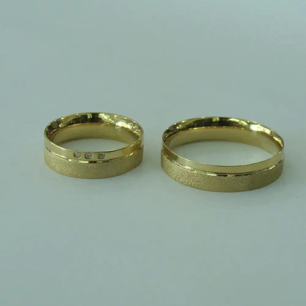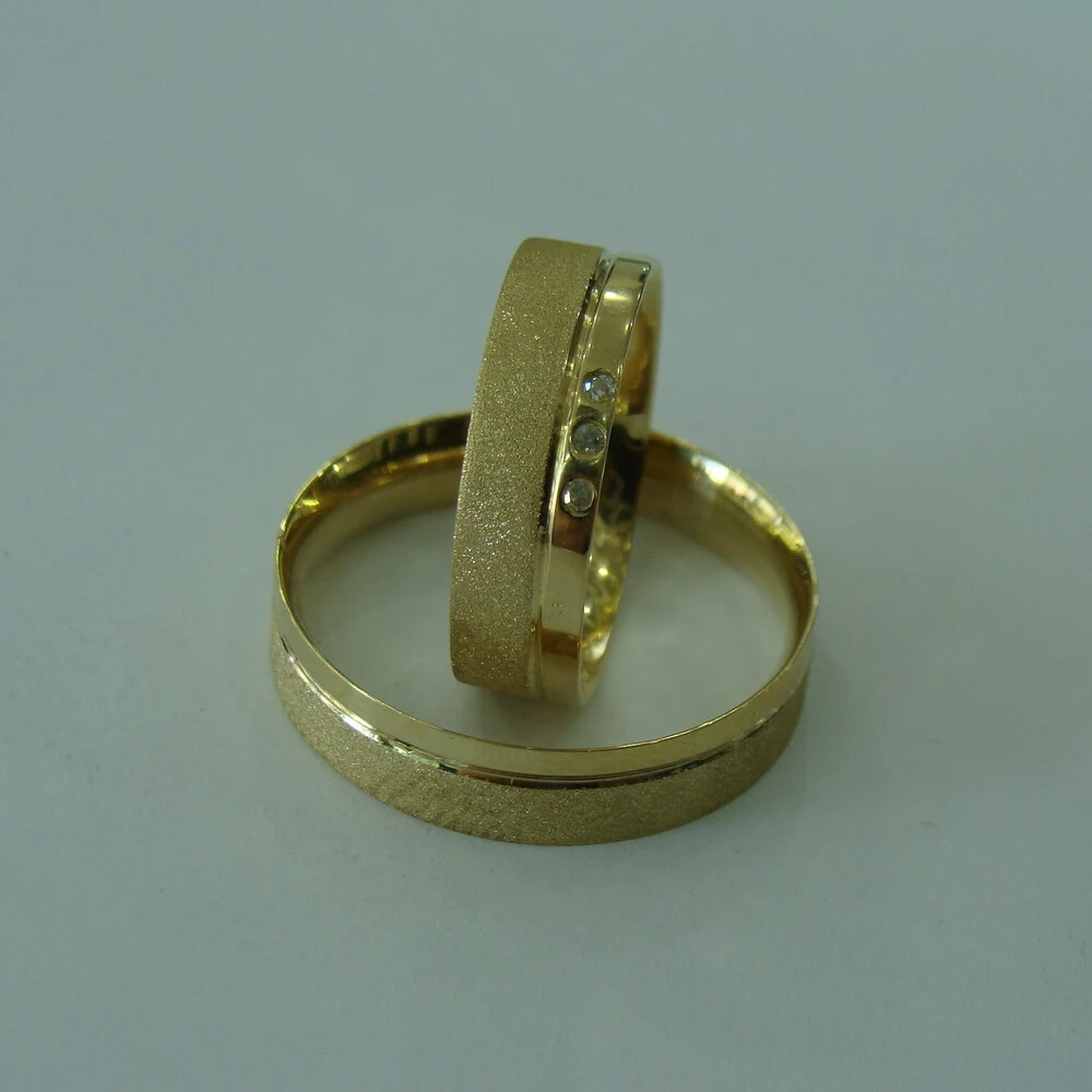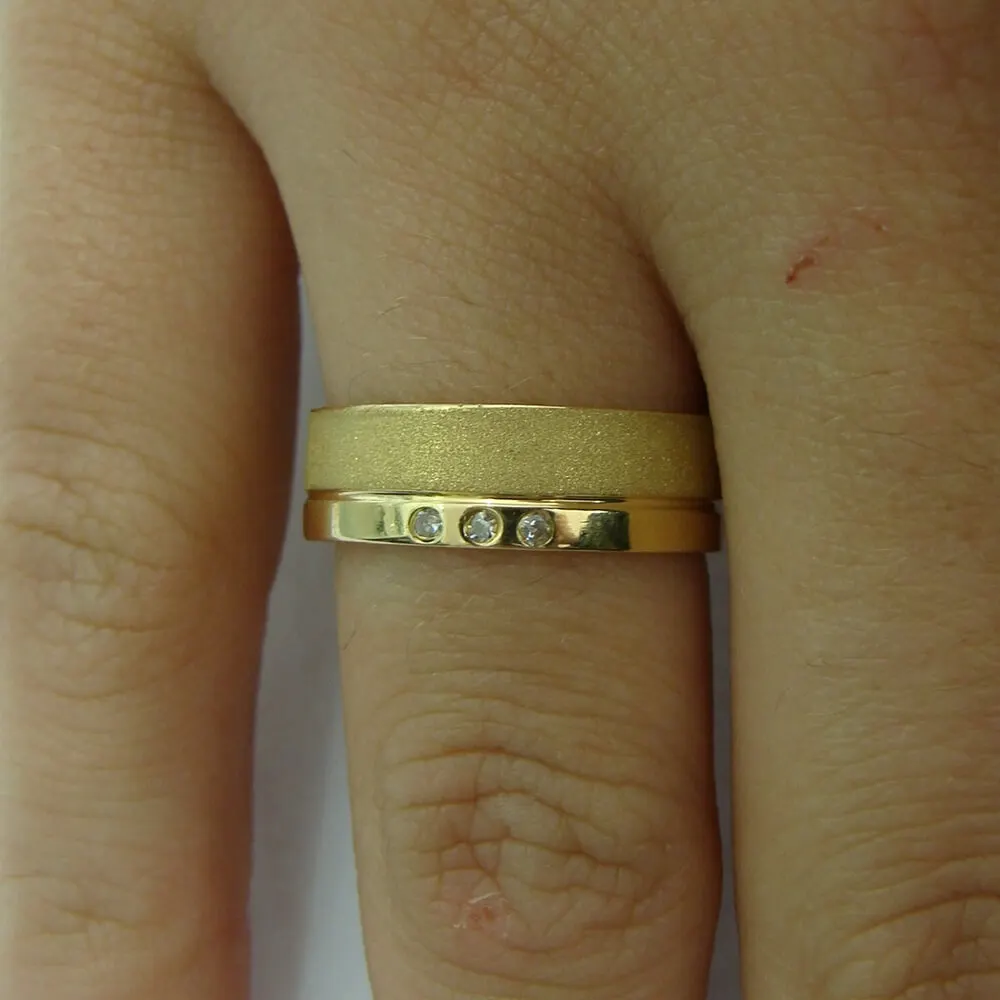 O friso central e as laterais lisas criam um contraste harmonioso entre textura e brilho, destacando ainda mais os três brilhantes cravados na aliança feminina — símbolos do passado, presente e futuro de um amor eterno. Uma peça marcante, feita para quem valoriza detalhes que eternizam momentos.