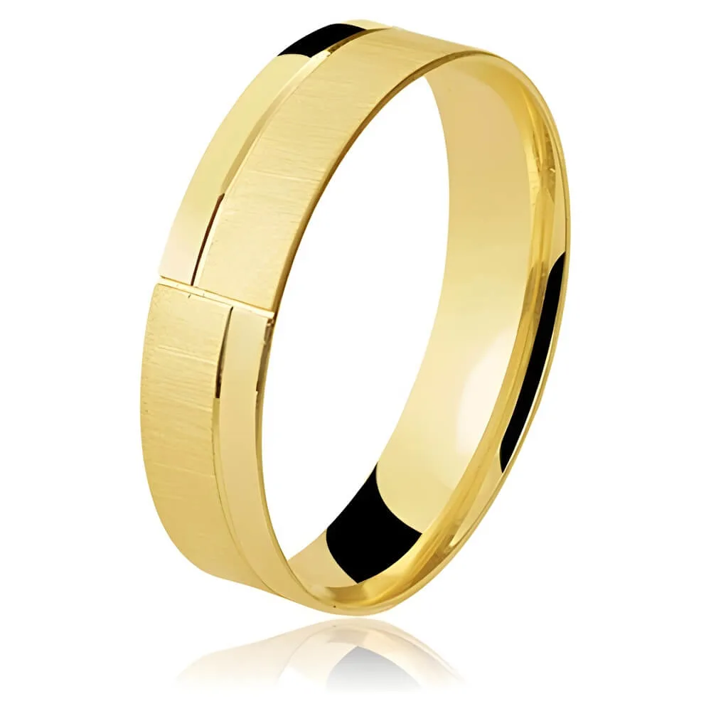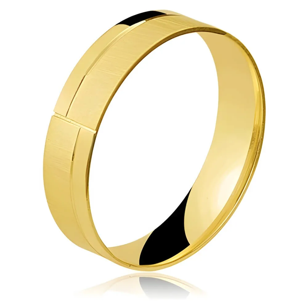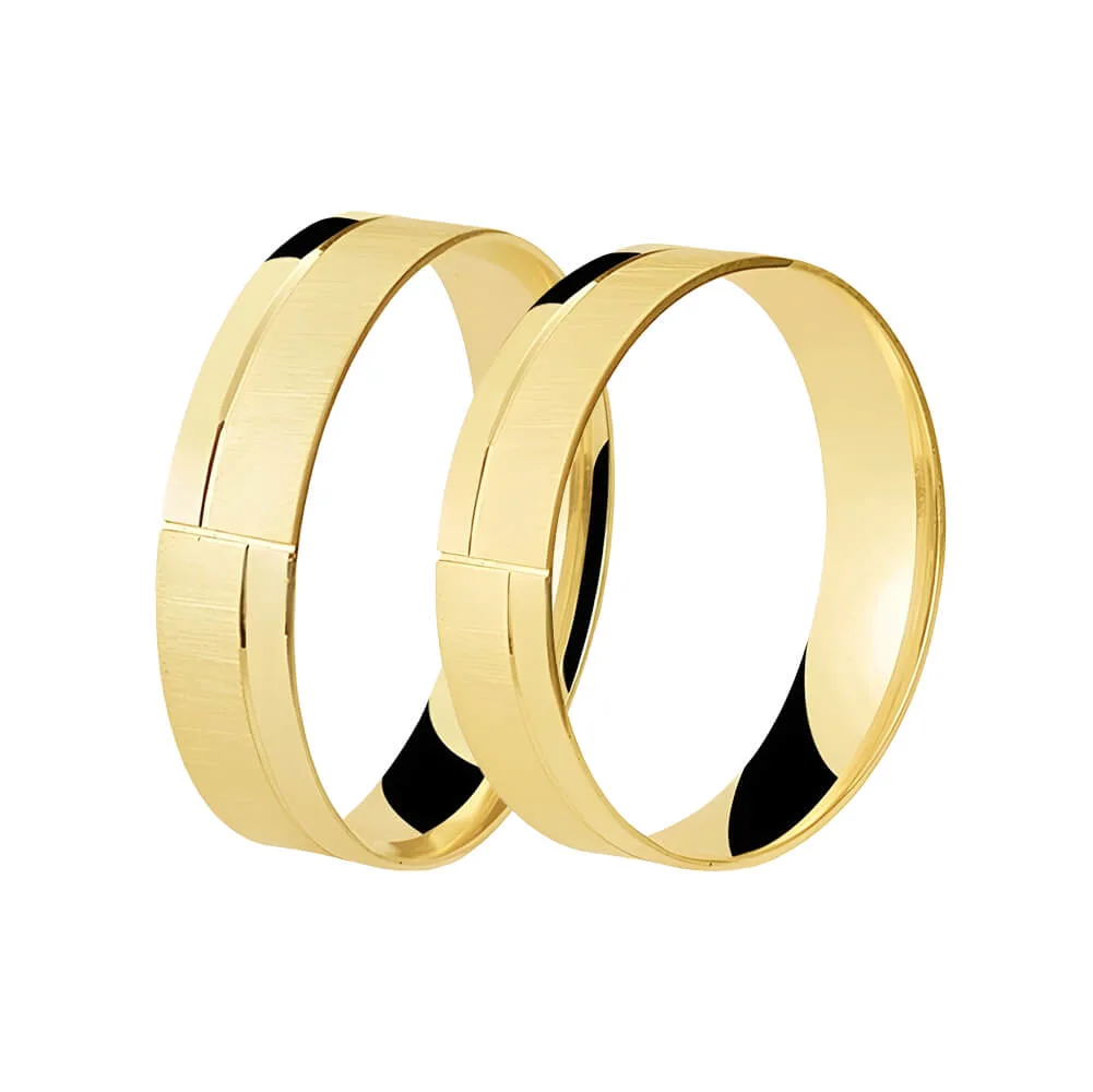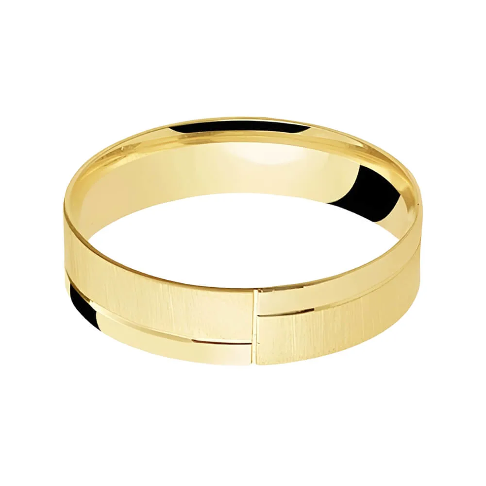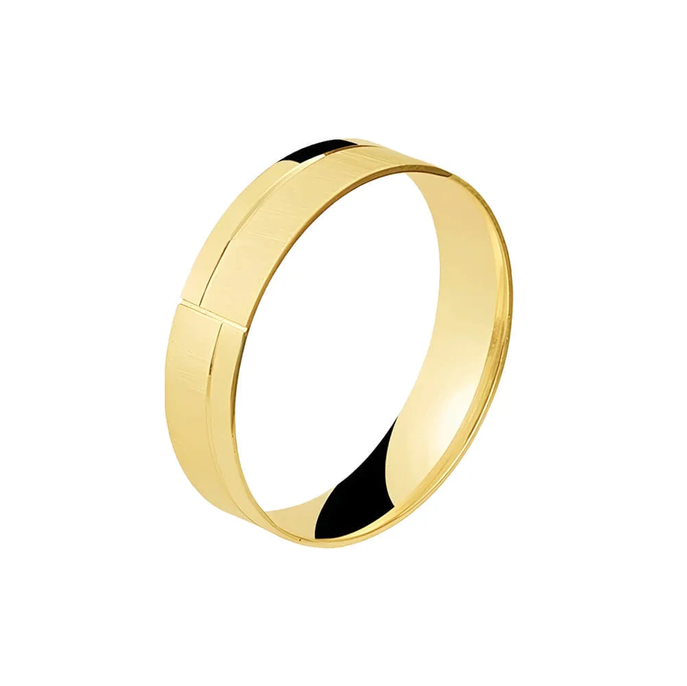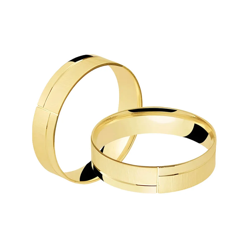 Os frisos alternados criam um efeito visual dinâmico e marcante, enquanto as laterais foscas adicionam profundidade e refinamento à peça. Uma joia perfeita para casais que buscam uma aliança única, que une tradição e modernidade em cada detalhe.
